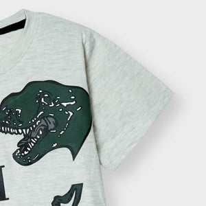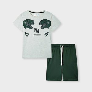 This summer suit features a white shirt with a fun "T-REX" dinosaur print on both sides of the chest. The middle print reads "nm" and "trinasaurous." Paired with green shorts, this boys "T-REX" printed dino summersuit is perfect for any adventure. Expertly designed for comfort and style.