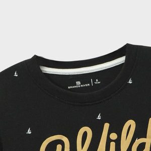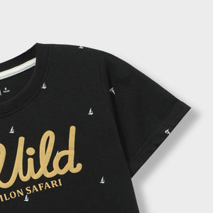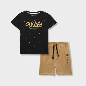 Unleash your little boy's wild side with our Black and Khaki 'Wild' summer suit. The black t-shirt features a bold 'Wild' print and a fun safari design, with Khakee Shorts for added charm. Perfect for any summer adventure!